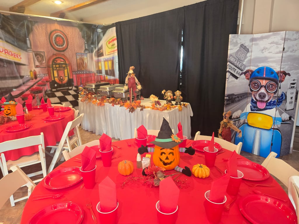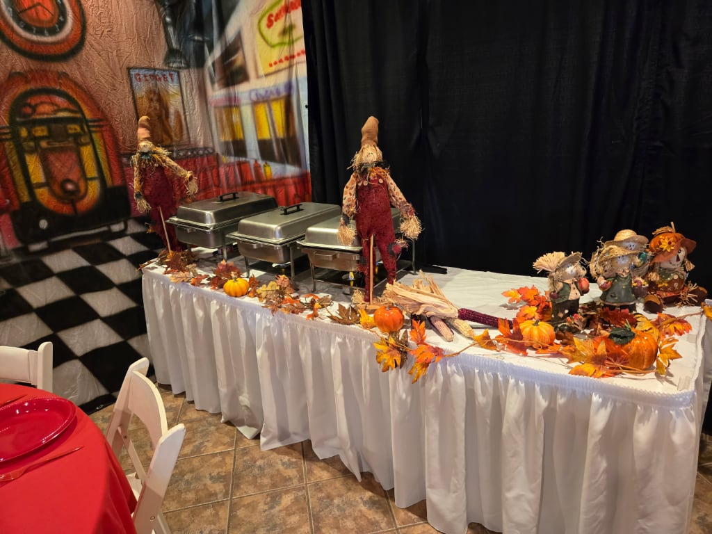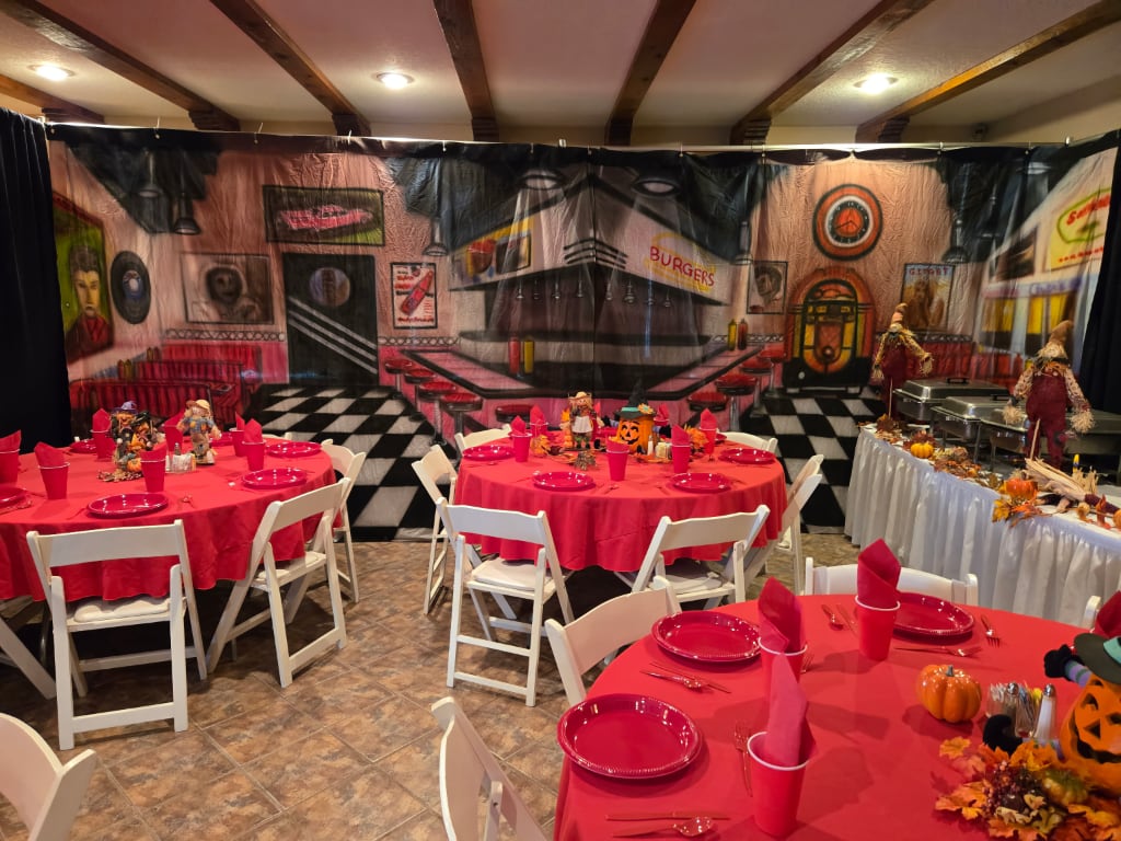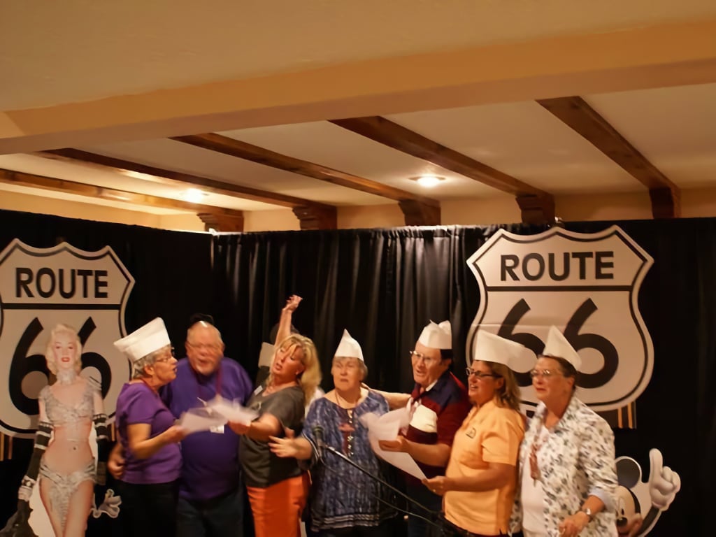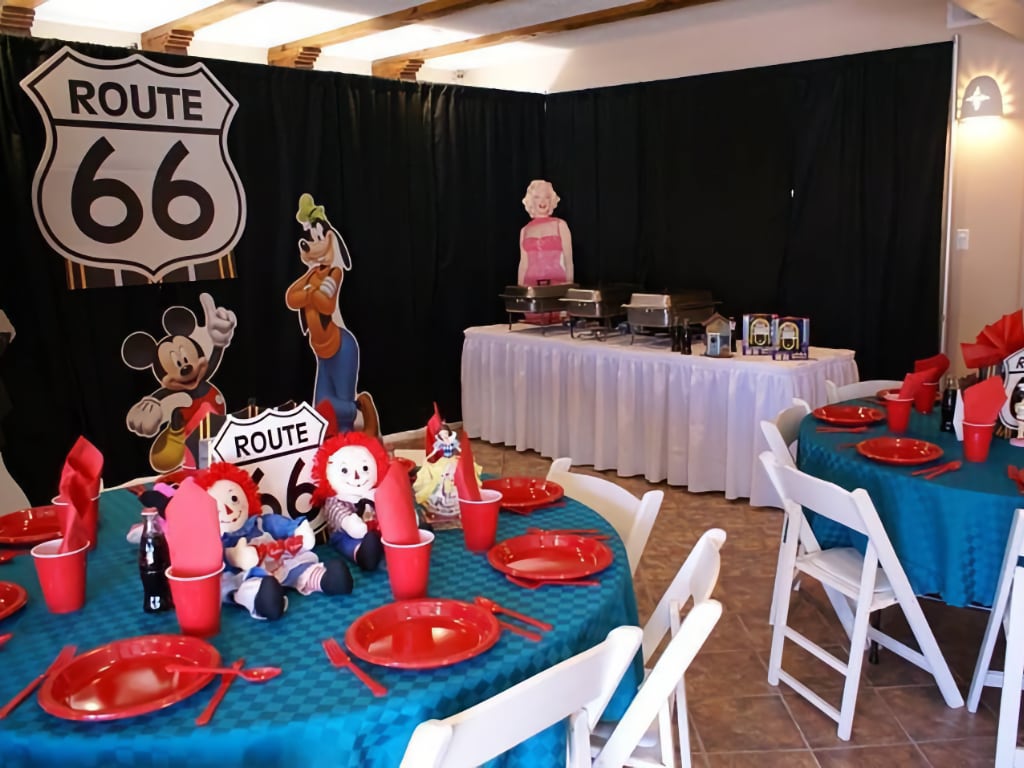 My firm owns its own event equipment, including our own tables; chairs; china; silver and glassware serving pieces; chafing dishes; 15 different changes of linens; props; sets; costumes, lighting systems; theatrical backdrops that I had made in Hollywood; and over 100 black and white cardboard standups of movie stars that go all the way back to the silent era, including famed entertainers; and Disney/Marvel characters. I had the theatrical backdrop that you see in these photos designed, specifically, for our Route 66 parties, and it stretches 20’ wide and stands 8‘ tall. We use our own pipe and drape to erect this backdrop and have our own crew to set up all the decorations you see in these photos. Each of our parties includes live entertainment, and during our “Route 66 “parties, we teach everyone how to do the Hokey Pokey, the Stroll, and have a singing contest, with us providing the lyrics to some of the most popular songs of the last few generations, such as “Splish Splash”, “Hound Dog”, and “Blueberry Hill”. We even show everyone how to perform the hula hoop, as you'll see below!