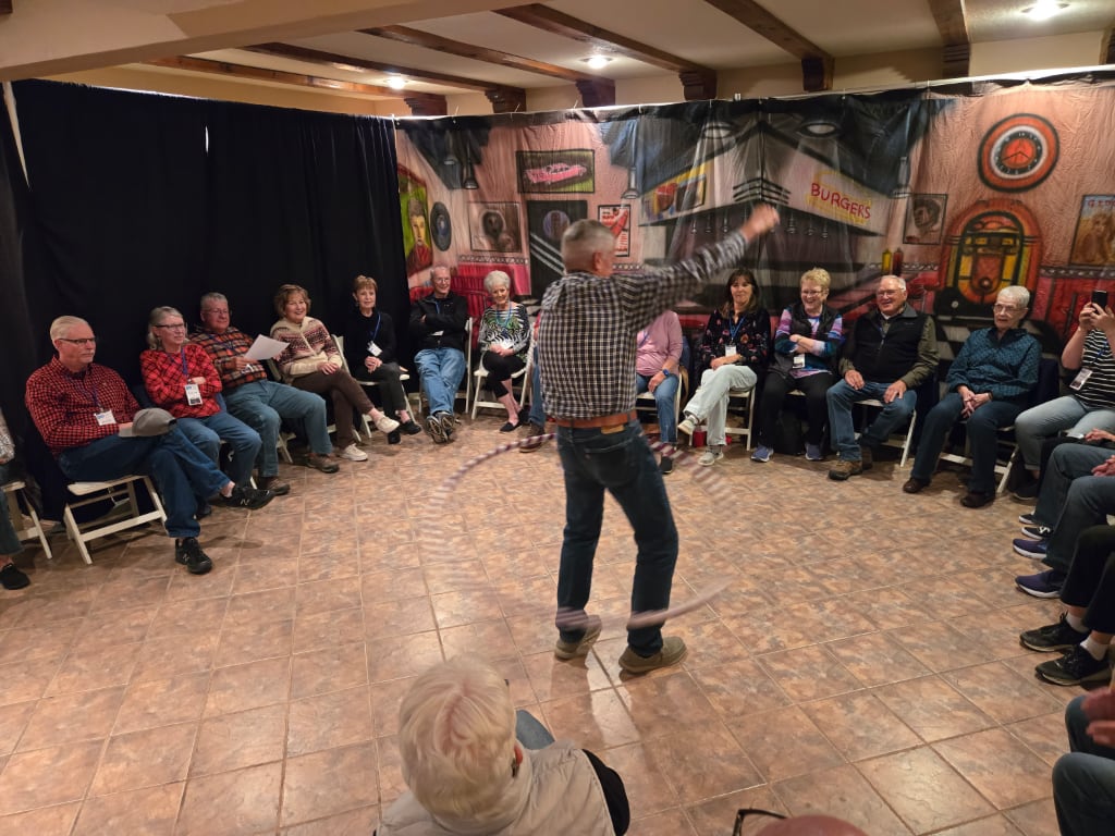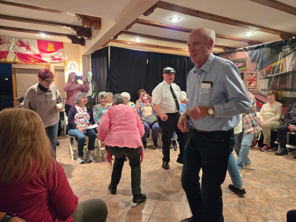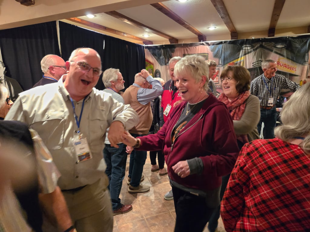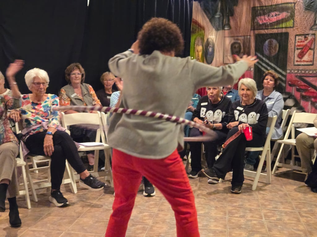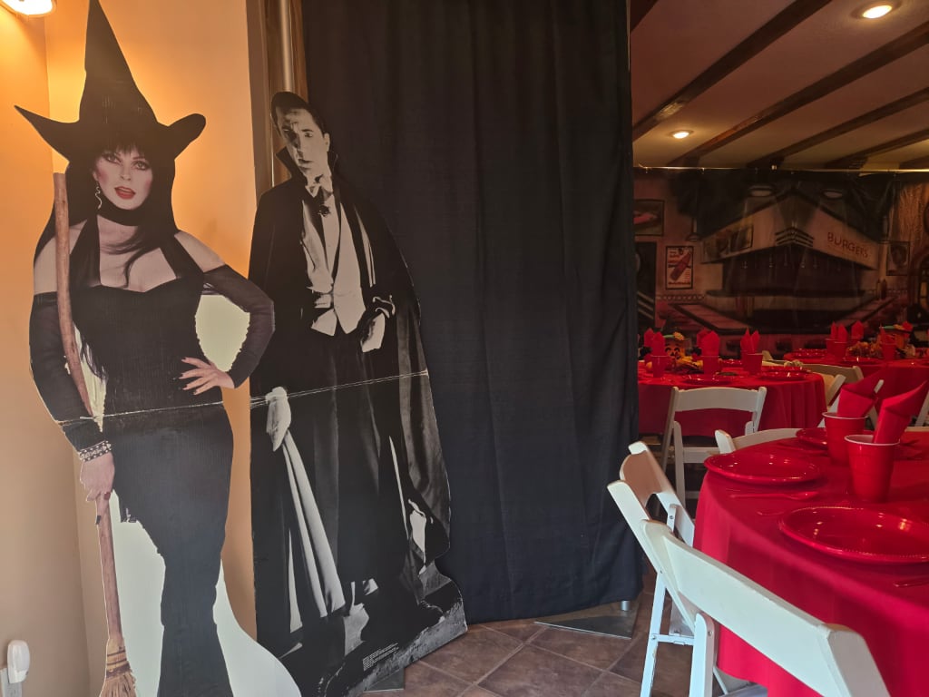 My firm owns its own event equipment, including our own tables; chairs; china; silver and glassware serving pieces; chafing dishes; 15 different changes of linens; props; sets; costumes, lighting systems; theatrical backdrops that I had made in Hollywood; and over 100 black and white cardboard standups of movie stars that go all the way back to the silent era, including famed entertainers; and Disney/Marvel characters. I had the theatrical backdrop that you see in these photos designed, specifically, for our Route 66 parties, and it stretches 20’ wide and stands 8‘ tall. We use our own pipe and drape to erect this backdrop and have our own crew to set up all the decorations you see in these photos. Each of our parties includes live entertainment, and during our “Route 66 “parties, we teach everyone how to do the Hokey Pokey, the Stroll, and have a singing contest, with us providing the lyrics to some of the most popular songs of the last few generations, such as “Splish Splash”, “Hound Dog”, and “Blueberry Hill”. We even show everyone how to perform the hula hoop, as you'll see below!